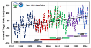 Namun, di balik keuntungan tersebut, kondisi laut Indonesia saat ini cukup memprihatinkan. Berdasarkan data BMKG, suhu rata-rata tahun 2024 mencapai 27,5°C dan menjadi suhu tertinggi sepanjang sejarah pengamatan. Sementara itu, data anomali tinggi muka laut (TML) dari NASA Sea Level Evaluation and Assessment Tools menunjukkan laju kenaikan permukaan laut di wilayah Indonesia sebesar 4,3 ± 0,4 mm per tahun.