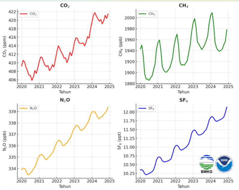 BMKG juga menyatakan bahwa konsentrasi gas rumah kaca seperti karbon dioksida (CO₂), metana (CH₄), dinitrogen oksida (N₂O), dan sulfur heksafluorida (SF₆), yang dipantau dari Stasiun Pemantau Atmosfer Global Bukit Kototabang, Sumatra Barat, mengalami peningkatan signifikan dalam lima tahun terakhir.